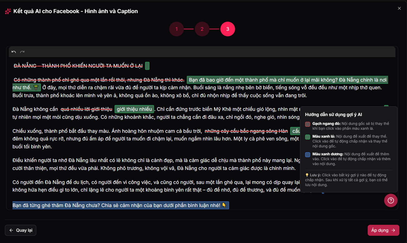 Sau khi xem xét và chọn các thay đổi phù hợp, nhấn Áp dụng và tiến hành đăng bài như hướng dẫn ở mục 1.2.