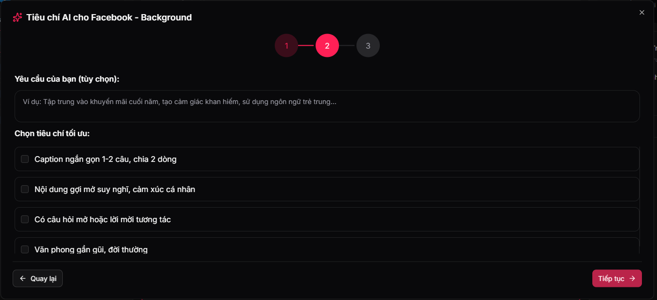Tính năng AI đề xuất giúp tối ưu caption theo đúng hành vi người dùng Facebook, nhằm tăng tương tác như lượt thích, bình luận và chia sẻ, đồng thời vẫn giữ nguyên thông điệp gốc của bài viết.