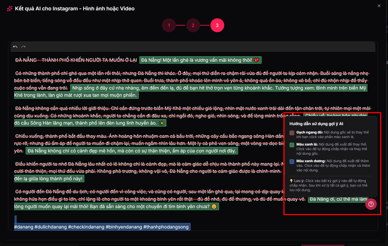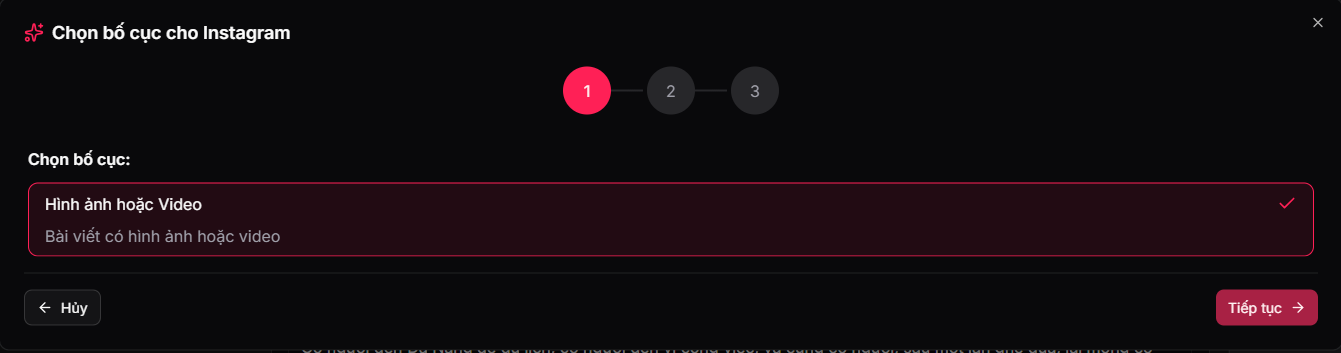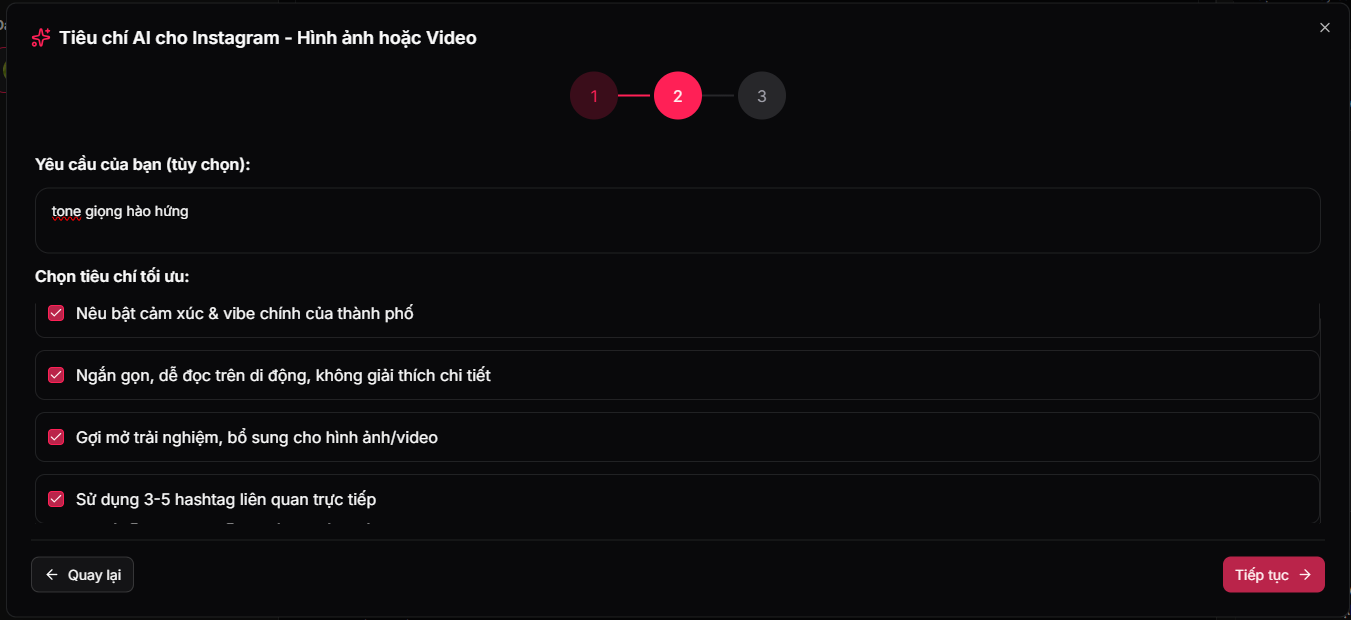 • Đối với Instagram, AI chỉ hỗ trợ bố cục Hình ảnh hoặc Video. Đây là nền tảng “xem trước – đọc sau”, nơi hình ảnh hoặc video quyết định sự chú ý ban đầu, còn caption đóng vai trò bổ trợ cảm xúc và ngữ cảnh.