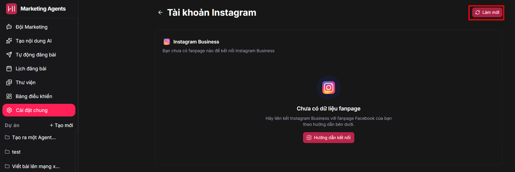 - Nhấn vào nút “Làm mới” (Refresh) để hệ thống tự động đồng bộ và cập nhật thông tin tài khoản Instagram vừa được kết nối.